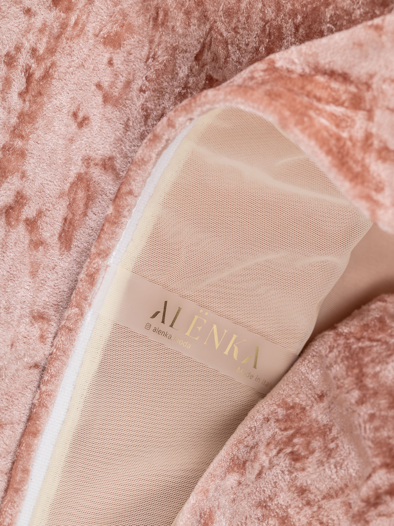 Velluto elasticizzato italiano dalla lussuosa lucentezza , morbido al tatto ma di grande impatto visivo. Sicurezza in ogni linea, eleganza in ogni dettaglio.